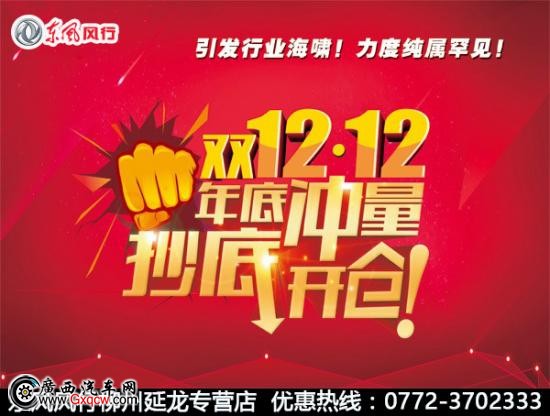 錯(cuò)過了“11.11”,怎能再錯(cuò)過“12.12”!東風(fēng)風(fēng)行柳州西環(huán)路延龍專營店雙十二購車優(yōu)惠節(jié)來啦! 即日起至12月12日,凡是來我店購買東風(fēng)風(fēng)行優(yōu)惠、大禮送不停!