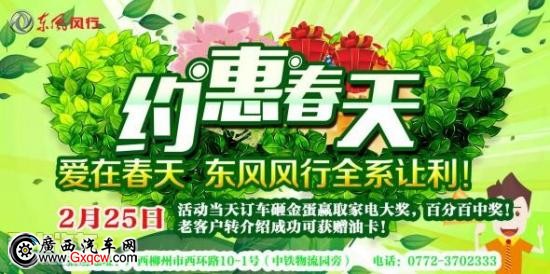 此刻,感謝之情溢于言表,2月25日誠(chéng)邀您蒞臨《約“惠”春天,東風(fēng)風(fēng)行全系讓利》新春團(tuán)購(gòu)會(huì)。我們將為您獻(xiàn)上現(xiàn)金鉅惠,以及驚喜不斷砸金蛋抽大獎(jiǎng)活動(dòng)!