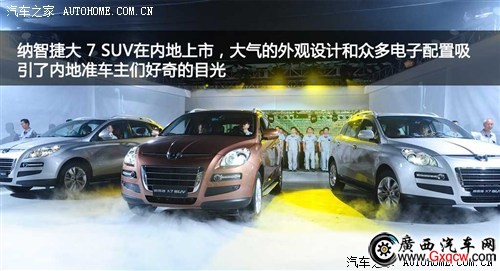 2011年7月28日,首款車型東風(fēng)裕隆納智捷大7 SUV在杭州正式下線,并于9月30日正式上市。納智捷 大7 SUV的售價(jià)區(qū)間在18.8-26.8萬元,價(jià)格區(qū)間非常討巧的卡在了自主品牌SUV和合資品牌SUV之間。大7 SUV無論是在性能上還是在配置上都繼承了LUXGEN 7 SUV的衣缽。車身參數(shù)與原版一致,但大7 SUV只有5座版本,不過廠商表示以后會提供七座車型。