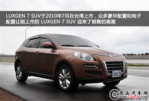 2010年,LUXGEN的第二款車型LUXGEN 7 SUV在臺灣上市,對手鎖定本田CRV和豐田的RAV4。 LUXGEN 7 SUV采用了適時(shí)四驅(qū)的驅(qū)動(dòng)方式,動(dòng)力體統(tǒng)延續(xù) LUXGEN 7 MPV的2.2升渦輪增壓發(fā)動(dòng)機(jī)和5速手自一體變速箱。配置方面,LUXGEN 7 SUV依然延續(xù)了裕隆汽車高配置、高科技的特點(diǎn)。THINK 資訊平臺是必不可少的,除此之外例如帶有大燈清洗、隨動(dòng)轉(zhuǎn)向的自動(dòng)氙燈,10.2寸的超大液晶顯示屏,ESC車身穩(wěn)定系統(tǒng)等都在LUXGEN 7 SUV上出現(xiàn)。但前麥弗遜、后扭力梁的懸掛令LUXGEN 7 SUV的動(dòng)態(tài)性能受到限制。另外,LUXGEN 7 SUV還出現(xiàn)了如THINK 死機(jī)、減震器損壞等問題。