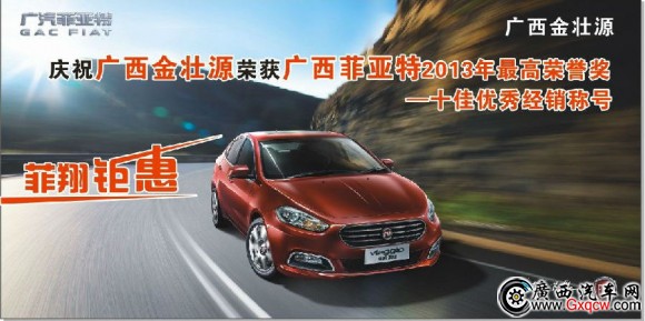 慶祝廣西金壯源店榮獲2013年廣汽菲亞特*高榮譽(yù)獎(jiǎng)——全國(guó)十佳優(yōu)秀經(jīng)銷商,即日起到店購(gòu)菲翔綜合優(yōu)惠12000元,送原裝DVD導(dǎo)航。詳詢廣西金壯源0771-3112789