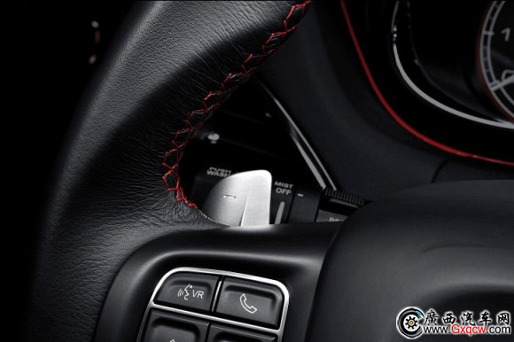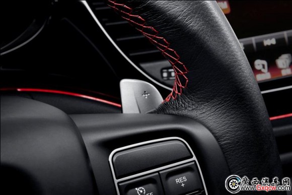 真皮方向盤,細節(jié)處的暗色鍍鉻裝飾和紅色雙縫線搭配