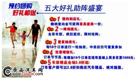 提前繳納意向金即可領(lǐng)取精美茶具套裝。挑戰(zhàn)全年價格底限!大集團才有大優(yōu)惠!限量好車搶購high不停!報名吧!詳詢:0771-3112789/3110228