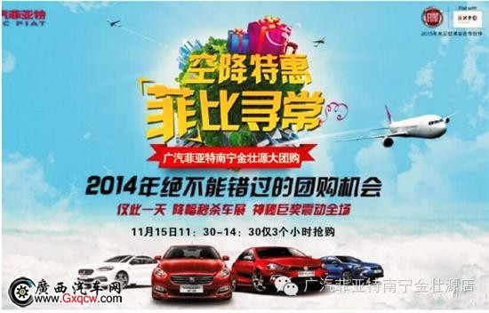 買車無須再等!11月15日廣汽菲亞特南寧金壯源店,2014年絕不可錯過的團購機會,廣汽菲亞特南寧金壯源限時鉅惠,瘋搶3小時,只有3小時!便宜到心動,搶到就賺到!置換更有專屬優(yōu)惠!震撼11月,廣汽菲亞特南寧金壯源感恩回饋,車價探底,驚喜不斷!