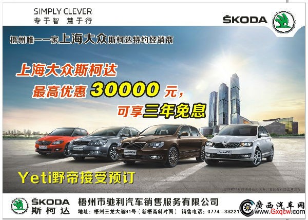 斯柯達(dá)10月*優(yōu)惠,*高可優(yōu)惠3萬元,三年免利息。eti野帝接受預(yù)定!買車送大禮!詳情請(qǐng)來店(電)咨詢!銷售熱線:0774-3822111