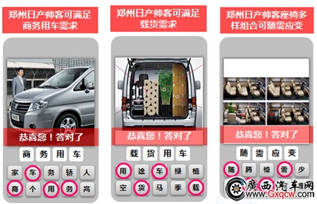 活動(dòng)期間,登陸鄭州日產(chǎn)官方網(wǎng)站,消費(fèi)者只需在“玩猜圖贏小米”活動(dòng)界面選擇“感興趣車型”(帥客或者NISSAN NV200),根據(jù)選擇車型,猜圖游戲?qū)㈦S機(jī)出現(xiàn)3張所選車型猜圖卡片(如下圖所示)。以帥客車型為例,游戲界面將出現(xiàn)帥客產(chǎn)品特征相關(guān)性能特征猜圖卡片,如“商務(wù)用車”、“載貨用車”、“隨需應(yīng)變”,只需要開動(dòng)大腦,根據(jù)圖片示意從給出文字中圈出正確答案,連續(xù)猜中兩張圖片就能過關(guān),留下聯(lián)系方式便可以參與抽獎(jiǎng)了。