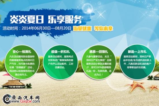 為了持續(xù)回饋廣大消費者,2015年6月30日至8月20日,鄭州日產(chǎn)將在全國范圍內(nèi)推出本年度的“炎炎夏日.樂享服務(wù)”夏季服務(wù)月活動,為您的愛車保駕護航,為盛夏出行提供品質(zhì)保障。