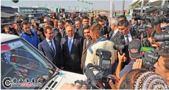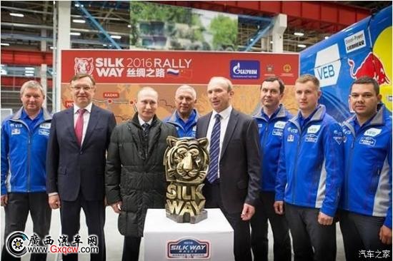 俄羅斯總統(tǒng)普京(左三)與絲綢之路拉力賽組織者合影
