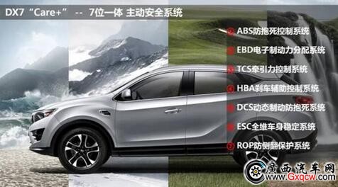 在主動安全方面,DX7搭載ABS防抱死控制系統(tǒng)、EBD電子制動力分配系統(tǒng)、TCS牽引力控制系統(tǒng)、ESC全維車身穩(wěn)定系統(tǒng)以及ROP防側(cè)翻保護系統(tǒng)等7大安全系統(tǒng)。其中,TCS與ABS、ESC相輔相成,防止側(cè)滑的產(chǎn)生;而ROP能在汽車急轉(zhuǎn)彎時迅速降低發(fā)動機扭矩并對車輪實施制動,防止側(cè)翻,使SUV達到轎車一樣的安全、靈敏的駕控水準。