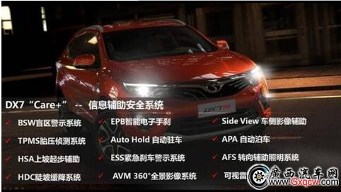 DX7采用超高強度籠式車身結(jié)構(gòu),高強度鋼占車身結(jié)構(gòu)60%,針對駕乘人員重點區(qū)域進行了特別強化;應(yīng)用了高強度前/尾防撞橫梁、可潰縮式方向管柱,以及預(yù)折彎式發(fā)動機艙蓋和發(fā)動機蓋鉸鏈設(shè)計兩項設(shè)計,使碰撞發(fā)生時,發(fā)動機艙蓋能夠折彎,避免發(fā)動機蓋直接擠入座艙,有效減小對駕乘人員的傷害。