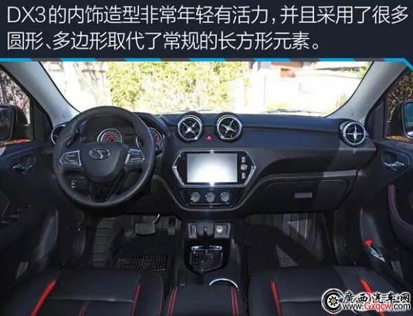 DX3的內(nèi)飾同樣年輕大膽,原創(chuàng)度很高,我們可以看到大量的圓形和多邊形元素,取代了常見(jiàn)的矩形。
