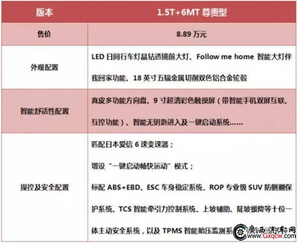 在三款車型中,1.5T+6MT尊貴型是起步價(jià)車型,售價(jià)僅為8.89萬(wàn)元,但在配置上絕對(duì)有PK同級(jí)別頂配車型的實(shí)力,像集成LED日間行車燈晶鉆透鏡前大燈、Follow me home 智能大燈伴我回家功能、真皮多功能方向盤(pán)、9寸超清彩色觸摸屏(帶智能手機(jī)雙屏互聯(lián)、互控功能)、北斗+GPS雙模3D語(yǔ)音導(dǎo)航系統(tǒng)、定速巡航/無(wú)限速系統(tǒng)、一鍵啟動(dòng)+無(wú)鑰匙進(jìn)入等諸多同級(jí)車型僅中高配選配的配置,盡數(shù)擁有。