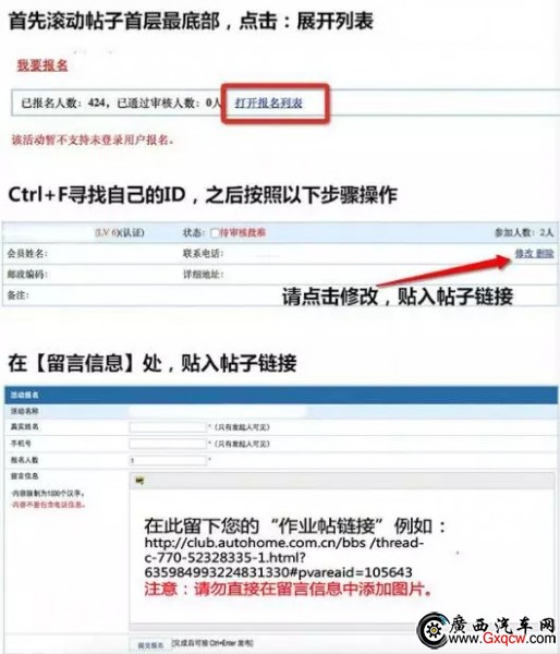 3、如果已報名但未留參賽作業(yè)帖鏈接或者是留言信息欄內(nèi)只有帖子內(nèi)容,沒有黏貼作業(yè)貼鏈接的車主,請按下圖指示操作!