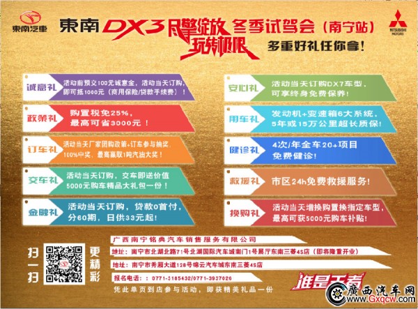 11月19日東南汽車DX3 SRG試駕會·南寧站即將開啟,魅力賽道即將為DX3 SRG的激情所點(diǎn)燃,在活動現(xiàn)場,將有由專業(yè)車手組成的教練團(tuán)隊(duì)首先對試駕者進(jìn)行深入和細(xì)致的技術(shù)講解以及極限操控技巧展示,車主可以在專業(yè)車手的指導(dǎo)之下,進(jìn)行包括極限繞樁、直線加速、高速控制過彎等科目,這些科目幾乎涵蓋了專業(yè)車手訓(xùn)練的全部科目。通過深度試駕,體驗(yàn)DX3 SRG人車一體的操控愉悅,享受"專業(yè)高手"的隨心駕馭、游刃有余的自如感。