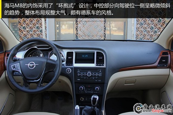 內(nèi)飾方面,海馬M8采用了中控臺“環(huán)抱式”設(shè)計,整體布局中規(guī)中矩,給人很規(guī)整的感覺,這點(diǎn)頗有德系車的風(fēng)格。顏色采用上深下淺的搭配方式,中間加入了仿木紋圖案的裝飾條用來提升檔次。