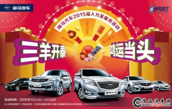 2015年1月31日至2月15日,海馬汽車一年一度的“福入萬家”售后服務優(yōu)惠活動如約啟動。此次活動以“三羊開泰 鴻運當頭”為主題,在羊年春節(jié)到來之際,海馬為所有車主送上免費的冬季專項檢測,全心保障車主冬季無憂出行。并且參與活動還有機會贏取精美大禮、純正機油、手機話費卡、食用油等超級大禮,福氣手氣一起來,大禮多多。