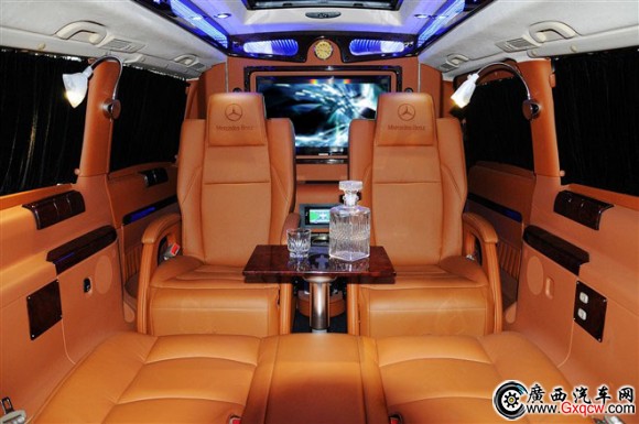 后艙前部是兩個(gè)全尺寸的航空頭等艙豪華座椅,講到這個(gè)座椅真的要好好說(shuō)一下,看似簡(jiǎn)單的座椅卻包含著奔馳工程師孜孜不倦的努力。整張座椅采用全手工縫制, 材料選用來(lái)自巴伐利亞地區(qū)18個(gè)月大的小牛皮,精制而成,皮質(zhì)硬中帶軟,紋路均勻,透氣性極好。為了坐的更舒適,奔馳工程師通過(guò)多達(dá)87次的試驗(yàn),結(jié)合各 種身高,各種體重的人體特點(diǎn),設(shè)計(jì)了現(xiàn)在的這張座椅,無(wú)論乘坐者的身高是多少,體重是多少,座椅的弧度都將和身體完美的貼合,對(duì)每一寸肌膚都襯托到位,坐 上去,將會(huì)感覺(jué)到前所未有的舒適。座椅可以360度旋轉(zhuǎn),配合可拆卸桌板,組合形式多種多樣。兩個(gè)座椅的后面是一張采用相同皮質(zhì)的3人座沙發(fā),坐感同樣舒 適,只需輕輕一按,在10秒鐘的時(shí)間,它可以變成一張1M7*1M4的雙人床,通過(guò)和前排座椅的對(duì)接,長(zhǎng)度可以達(dá)到2M2,當(dāng)然,相信后部座椅可以平放成 床這樣的設(shè)計(jì)很多商務(wù)車都采用,但奔馳的這張床,請(qǐng)仔細(xì)看,它并沒(méi)有完全放平,這就是奔馳高科技和人性化的完美結(jié)合,它采用了黃金5度角的設(shè)計(jì),通過(guò)科學(xué) 研究證明,人體在這樣的角度上休息是最完美的,幾乎接近在太空中的睡眠感覺(jué)。試想一下,躺在這樣的床上休息,看著車頂漫天的星星,就像彷佛置身在太空中, 絕對(duì)有身臨其境的感覺(jué)!
