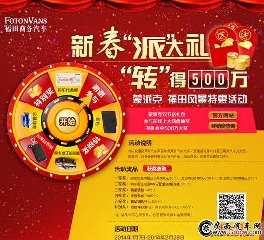 即日起到2月28日,前來南寧市安吉大道11號南寧桂川汽車銷售有限責(zé)任公司或登陸福田商務(wù)汽車官網(wǎng)即可參與在線大轉(zhuǎn)盤抽獎活動,將有機會獲得500萬大獎。