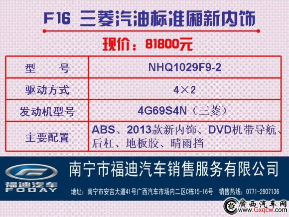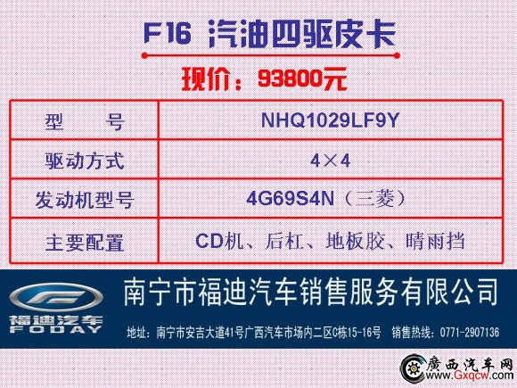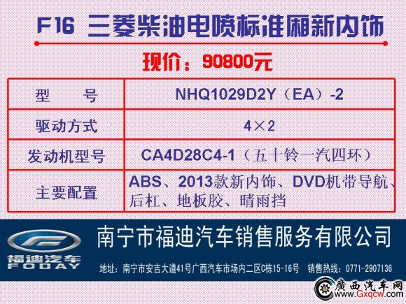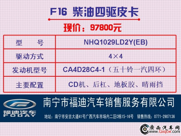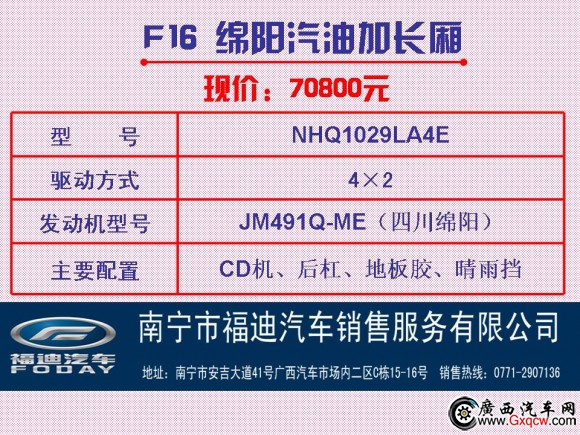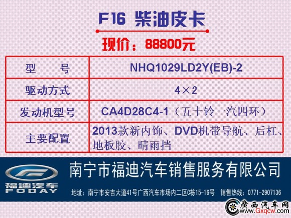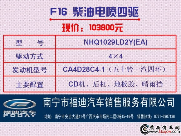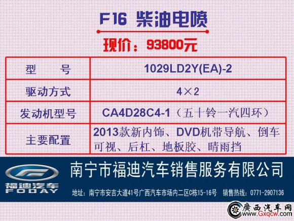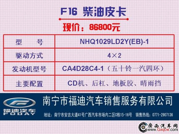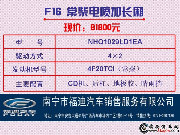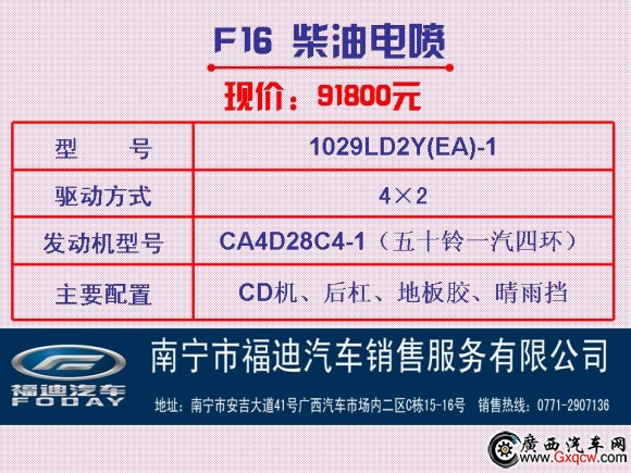 南寧市福迪汽車銷售服務(wù)有限公司公司地址:南寧市安吉大道41號廣西汽車市場內(nèi)二區(qū)C棟15-16號銷售服務(wù)熱線:0771-2907136