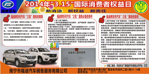 3月13日上午,南寧市福迪汽車銷售服務(wù)有限公司積極參與由自治區(qū)工商局、南寧市工商局主辦的消費者權(quán)益法宣傳活動,此次活動在廣西汽車市場內(nèi)舉行,今年“3•15”國際消費者活動日的主題是:新“消法”、新權(quán)益、新責任。為配合此次宣傳活動,公司還專門制作了一期福迪汽車“三包”服務(wù)的宣傳報板,贏得了廣大現(xiàn)場消費者們的贊許。