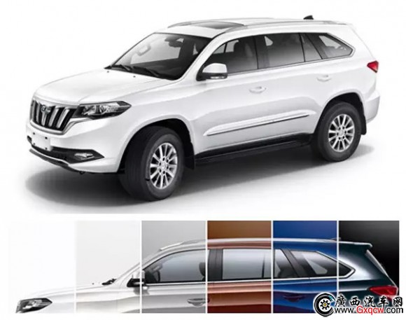 全車系共有七種顏色,霧影白、香檳銀,鉆石銀、赤褐色、海浪藍以珠光黑。絕對可以滿足每一個人不同的喜好。車身正臉5條豎幅鍍鉻裝飾霸氣十足。中網(wǎng)下沿的鍍鉻裝飾裝延伸至大燈底部,與大燈很好的融為一體,說到大燈,大燈的設(shè)計簡潔大方,結(jié)合燈眉的設(shè)計非常提神。車身側(cè)面,線條飽滿,車門厚實,車窗輪毅扁平,是比較潮流的運動風格。車尾設(shè)計多出細節(jié)采用直線條,尾燈更是采用更為突出的犀利設(shè)計,還有車頂?shù)母呶粩_流尾翼和鯊魚鰭天線,無一不彰顯SUV車的硬朗、剛勁。