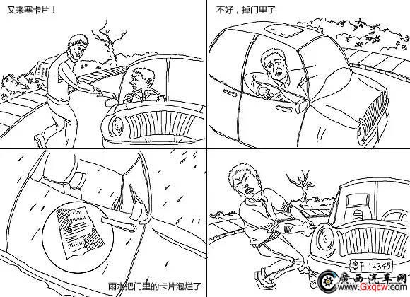 卡片順著車窗掉進(jìn)車門內(nèi)部,不僅有可能導(dǎo)致車窗升降器損壞,同時遇到下雨,雨水就會滲進(jìn)去將名片泡爛,堵塞排水口,造成雨水無法排出。