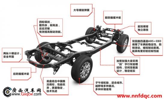兩縱10橫的越野車地盤設(shè)計,采用寶鋼B510L汽車鋼板材料,和50噸卡車的大梁是一樣的材質(zhì)。普通的最多是8個橫梁。