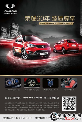 韓國雙龍汽車經(jīng)歷60年專業(yè)SUV的磨礪之路,鑄就了亞洲專業(yè)SUV領(lǐng)導(dǎo)者地位。作為雙龍汽車主打車型之一,柯蘭多自1983年誕生之日起,傳承高端SUV之精髓,以優(yōu)異性能和超高性價比撼動國際市場。適逢雙龍品牌誕生60周年之際,特別推出柯蘭多典藏版,增加多項(xiàng)炫酷、精純專屬配置,給您帶來全新“都市越野者”的非凡體驗(yàn),更讓您獨(dú)享一份尊貴和榮耀。