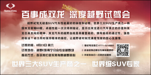 越野試駕無疑是SUV汽車性能**的體現(xiàn)和證明。世界三大SUV生產商之一韓國雙龍榮耀60載,卓越性能一次次得到驗證,顯示出雙龍進口汽車真正的價值和雙龍志真至純的精神。雙龍汽車的越野血統(tǒng)是毋庸置疑的,擁有超高的通過性、強勁的柴油 T 動力同時保持精準的操控,讓越野者時刻充滿著駕駛的信心及激情。