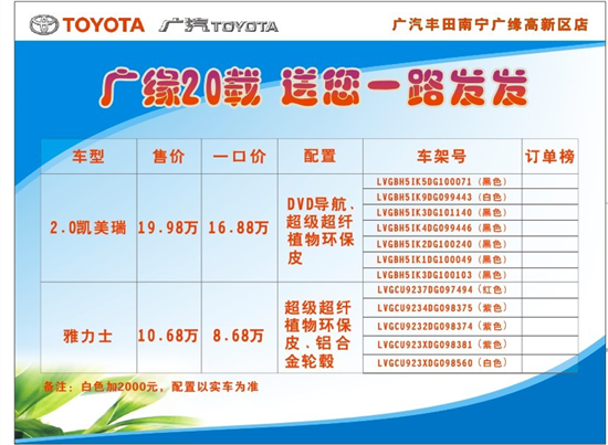 “廣緣感恩20載”廣汽豐田南寧廣緣高新區(qū)店7月6-7日,廣汽豐田全車系冰點(diǎn)價(jià),凱美瑞16.88萬輕松“開”回家(還送DVD導(dǎo)航),雅力士1.6萬“貸”回家。推薦好友購車還有千元券贈(zèng)送哦!給你過一個(gè)清爽的夏季,想買車的朋友,心動(dòng)就趕快行動(dòng)吧!讓您這個(gè)夏天沁爽到底!廣緣高新區(qū)店還精心為您準(zhǔn)備了各種感恩好禮,感興趣的朋友趕緊到店一起來分享的購車驚喜!