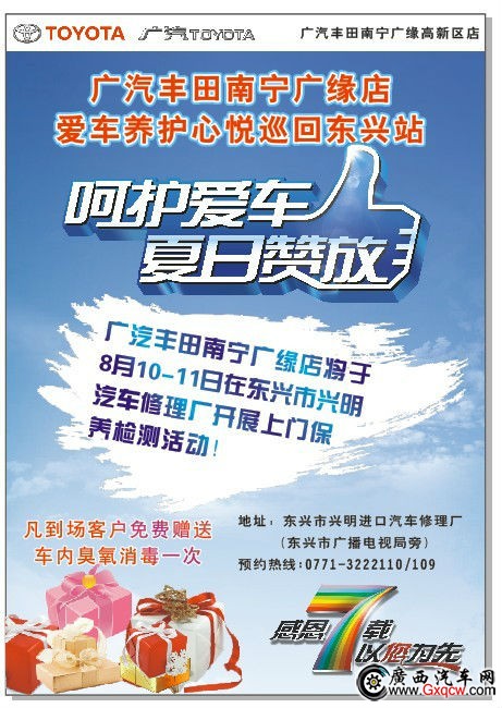 “夏季呵護•心悅行動”巡回東興站開始啟程,廣汽豐田廣緣南寧高新區(qū)店將于8月10-11日在東興市興明汽車修理廠開展上門保養(yǎng)檢測活動,為車主提供省時、專業(yè)的快修服務。針對各城鎮(zhèn)定期開展維修保養(yǎng)巡回服務,到您的家門口為您的車輛排除日常用車積累的小故障,保障您的用車安全!凡到場客戶免費贈送車內臭氧消毒一次。