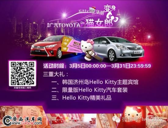 從3月5日到3月31日,“來自廣汽TOYOTA的貓女郎——Kitty華麗變身”特別購車活動將在廣汽豐田天貓商城舉行。只要你喜歡致炫、逸致,熱愛Hello Kitty,就可以加入我們,贏取屬于您的特別定制Hello Kitty!
