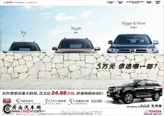 在進(jìn)入年終購(gòu)車最激烈的競(jìng)爭(zhēng)階段之時(shí),中高端SUV車市迎來(lái)一枚重磅炸彈。2014年11月01日,廣汽豐田正式推出史上最強(qiáng)金融購(gòu)車方案“漢蘭達(dá)好易購(gòu)”。此次活動(dòng)是專門(mén)針對(duì)漢蘭達(dá)車型開(kāi)展的專項(xiàng)金融活動(dòng),將為消費(fèi)者提供史上最便捷、優(yōu)惠的購(gòu)車服務(wù)。即日起至12月31日,凡購(gòu)車客戶參與活動(dòng),即可享受5萬(wàn)超低首付、5年超長(zhǎng)質(zhì)保,5千置換補(bǔ)貼,讓您輕輕松松,“貸”走漢蘭達(dá)!