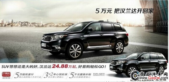 據(jù)了解,11月1日至12月31日,廣汽豐田推出“漢蘭達(dá)好易購促銷活動”,包括5萬元起超低首付、令車主無憂的3+2年延保及貼心的5000元置換補(bǔ)貼等一系列優(yōu)惠促銷政策。