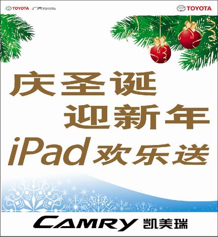 ◆凱美瑞星耀限定版 圣誕特惠2萬元+送原廠級HUD車速平視顯示器+送原廠炫光LED迎賓踏板 ◆凱美瑞尊耀限定版 圣誕特惠2.38萬元+送原廠雨擋+送原廠炫光LED迎賓踏板 ◆訂車客戶還可獲得超值禮品一份,更有機(jī)會贏得ipad時(shí)尚大禮!