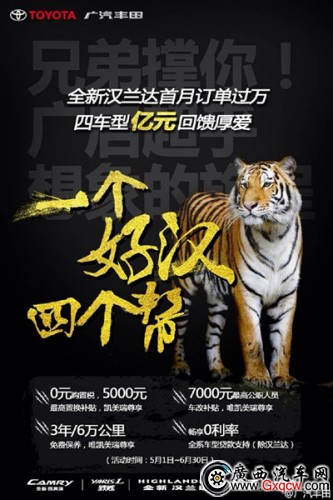 火辣五月,廣汽豐田為回饋廣大客戶支持,隆重推出“一個好漢四個幫全新漢蘭達首月訂單過萬四車型億元回饋”!