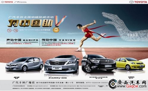 根記者從廣汽豐田南寧廣緣高新區(qū)店了解到,廣汽豐田廣緣店正在舉辦為中國加油,為奧運吶喊助“V”,活動,只要你到南寧廣緣高新區(qū)店參與中國加油,為奧運吶喊助“V”,將獲贈高級禮品一份,活動期間推出更多的購車優(yōu)惠活動,價驚全城!