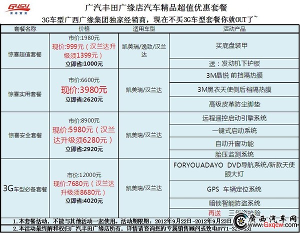廣汽豐田廣緣店汽車精品優(yōu)惠套餐9月22日-9月23日席卷而來,來廣緣花少錢,享受高品質(zhì)的精品服務(wù),包裝您的愛車,讓您的愛車設(shè)備更潮流,外觀更迷人,更駕駛更安全,使用更方便!