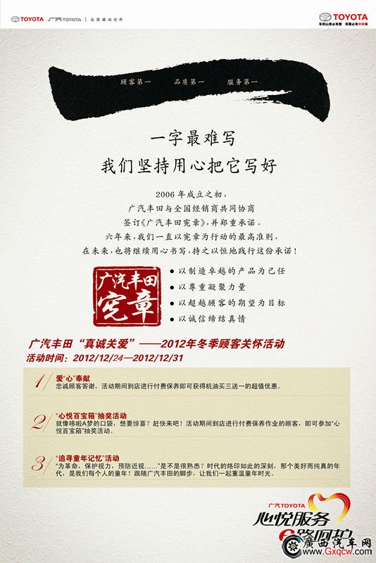 即日起廣汽豐田南寧廣緣高新區(qū)店推出真誠關(guān)愛,冬季送溫暖,給您的愛車過個溫暖的冬季,給您的愛車帶來專業(yè)、貼心、安全的維修保養(yǎng)服務(wù),我們擁有先進的維修保養(yǎng)設(shè)備,專業(yè)的維修保養(yǎng)技師,給您的愛車提供更專業(yè)的呵護!