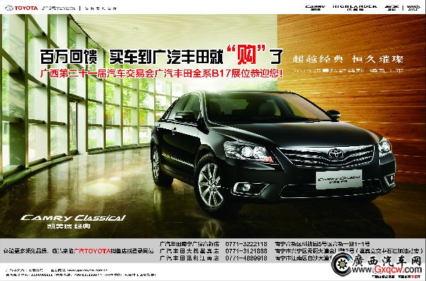 廣汽豐田大輿邕賓店:南寧市興寧區(qū)秀廂大道金川路2號(hào)(邕賓立交中石油加油站旁) 聯(lián)系電話0771-3121888 http://e.weibo.com/u/2607750940