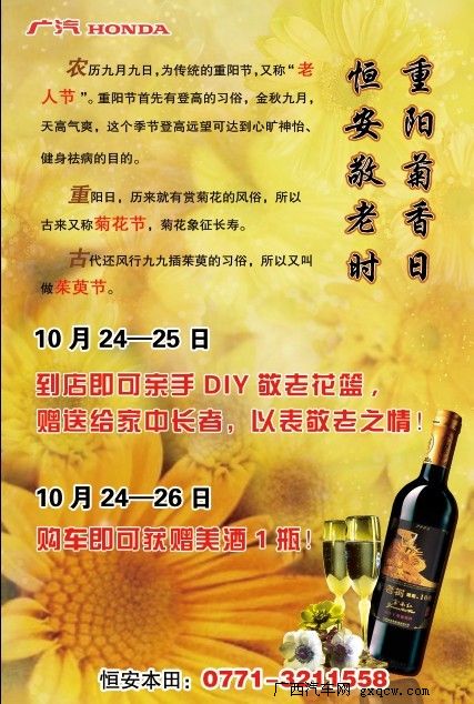 10月24-25日,來到恒安本田展廳即可親手DIY敬老花籃贈給家中長者,10月24-26日,到恒安本田購車還可獲贈美酒,與家人共慶佳節(jié)。