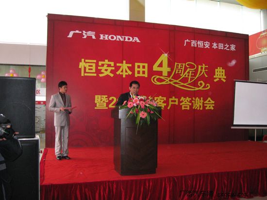 剛剛走過充滿挑戰(zhàn)的2009年,迎來恒安本田四周年的大好日子。儀式上公司總經(jīng)理梁平為慶典致辭,簡(jiǎn)明扼要而又點(diǎn)線帶面地向公司領(lǐng)導(dǎo)和嘉賓介紹了恒安本田一年來所取得的矚目成績(jī)。恒安本田車友會(huì)組織――恒友會(huì),已經(jīng)成為 全區(qū)*大的廣汽本田車友組織,一年來,舉辦的各種各樣、內(nèi)容豐富的活動(dòng)受到眾多車友的好評(píng)。對(duì)于廣大客戶的厚愛與支持,表示最衷心的謝意。梁總還對(duì)過去一年勤勤懇懇、兢兢業(yè)業(yè)的全體員工表示誠(chéng)摯的感謝,并希望和鼓勵(lì)大家在新的一年里,清醒的認(rèn)識(shí)我們成長(zhǎng)過程中所遇到的困難,正視我們與先進(jìn)的同行之間存在的差距,打造業(yè)績(jī),精細(xì)流程,重視客戶滿意度,齊心協(xié)力攜手向保持在廣西區(qū)域同品牌**位置的目標(biāo)而闊步邁進(jìn)!