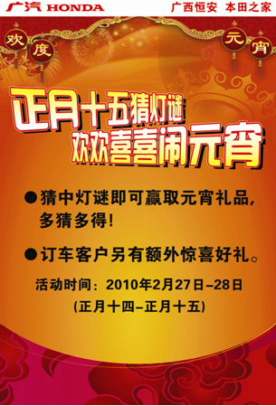 為了回饋新老客戶,喜迎虎年元宵,廣汽本田恒安店特于2月27日―28日在展廳舉行 “正月十五猜燈謎,歡歡喜喜鬧元宵”猜燈謎活動。