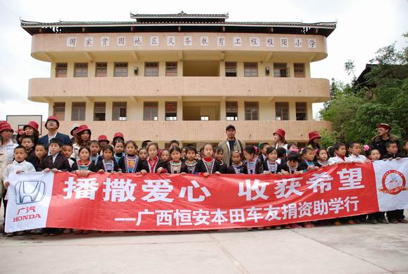 車主們紛紛拿出早已準(zhǔn)備好的書本文具等學(xué)習(xí)用品發(fā)給在場(chǎng)的小朋友,廣西恒安汽車的負(fù)責(zé)人龐女士還代表公司向程陽小學(xué)的校長捐獻(xiàn)了恒安人的助學(xué)金。