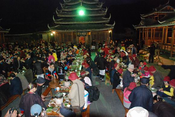 舞蹈結(jié)束,各家各戶搬來了桌子凳子,端上做好的飯菜。不一會(huì),整個(gè)操場(chǎng)就擺滿了座椅,豐盛的菜肴滿了桌子。飯菜備齊后,客人主人分別坐在兩側(cè),只聽到寨老一聲令下,站著舉杯一聲高呼“喊啦-唔呼,吁啦-喔呼”!百家宴開始了。飯桌上你來我往,觥籌交錯(cuò),大伙說著家常,唱著酒歌,場(chǎng)面熱鬧非凡。醉倒了遠(yuǎn)道而來的游客,醉倒了年邁的阿爸阿媽。這個(gè)時(shí)候終于滿足了我們吃著碗里看著鍋里的心態(tài),自己桌上的菜還沒有嘗完,就跑去別人的香啊。