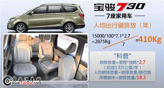 一臺(tái)滿足7人舒適乘坐的汽車,由于使用了先進(jìn)的DVVT(雙可變氣門正時(shí)系統(tǒng),使汽油充分燃燒)發(fā)動(dòng)機(jī)技術(shù)、輕量化處理,使其油耗僅為7.1L/100km。以1.5萬公里/年來計(jì)算,“7座家用車”寶駿730僅消耗了一臺(tái)A級(jí)轎車的燃油,但卻實(shí)現(xiàn)了7人的交通出行,在人均年出行碳排放(年)的數(shù)據(jù)計(jì)算中,寶駿730僅為410Kg。