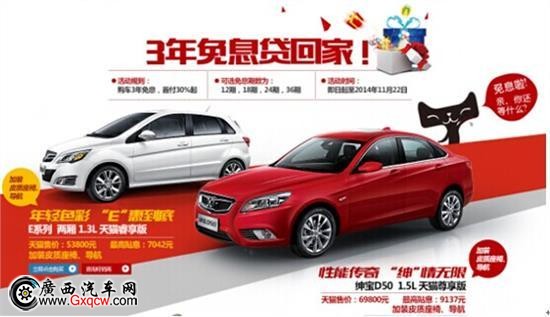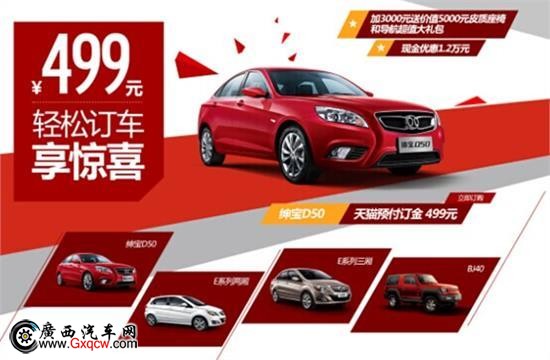 雙十一期間,北京汽車天貓店將為客戶推出兩款特供車型,紳寶D50 1.5L天貓尊享版售價6.98萬元、E系列兩廂天貓睿享版售價5.38萬元。
