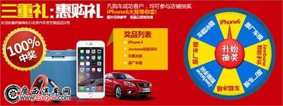 第三重 “惠購禮”,凡是購車用戶均可參與店鋪抽獎,100%中獎機(jī)會贏取iphone6、車載冰箱、精美車模等北京汽車為回饋廣大消費(fèi)者而精心準(zhǔn)備的各種獎品。