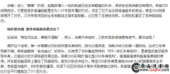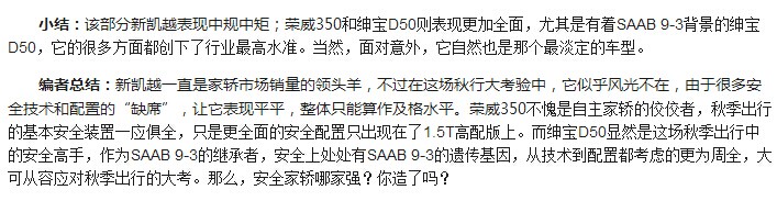 小結(jié):實(shí)際上,無論加熱除霧功能,還是安全帶未系提醒,都已是A級(jí)車的常規(guī)配置,所以,它的有無不是反應(yīng)車型之間的技術(shù)差距,而更多的是一種細(xì)心程度的體現(xiàn)。作為A級(jí)家轎市場的新起者,紳寶D50和榮威350顯然很周全,倒是凱越讓人有些遺憾,也因此,它在這場安全對(duì)抗賽中,起步有點(diǎn)慢。