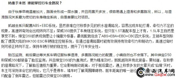 當(dāng)下正是自駕旅行的黃金季節(jié),然而汽車安全也面臨著“多事之秋”的大考驗(yàn)。早晚溫差大,霜霧基本天天有,再加上讓人徹底“醉了”的“仙境”霧霾天,秋季出游還真要面對(duì)不小挑戰(zhàn)。而此時(shí)如果你能擁有一輛安全過人的家用轎車,相信就會(huì)省心很多。那么問題來了,安全家轎哪家強(qiáng)?藍(lán)翔的汽車修理工自然回答不了這個(gè)問題,不如跟小編一起對(duì)比下三款熱門家轎——紳寶D50、榮威350、新凱越,讓你速速找到答案。
